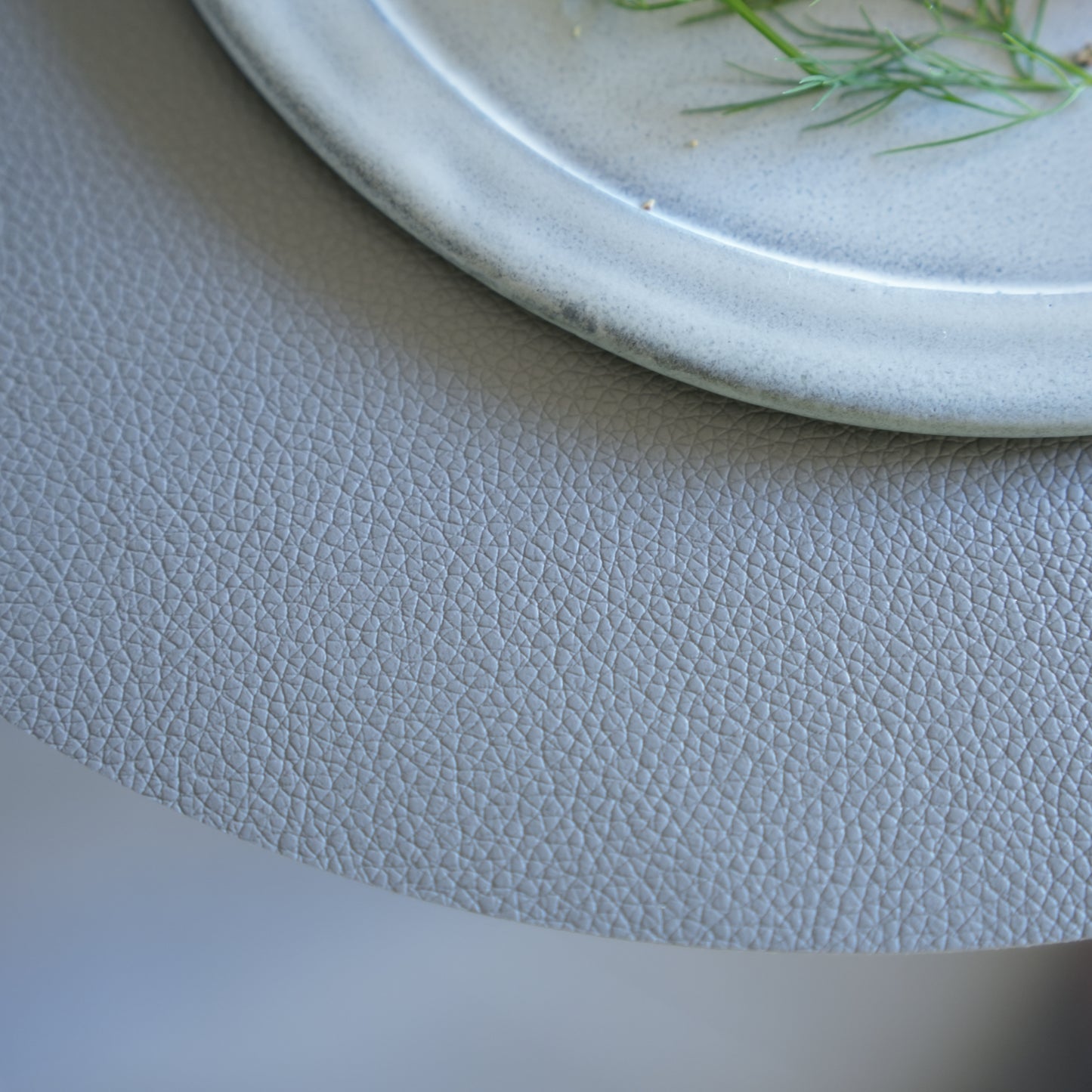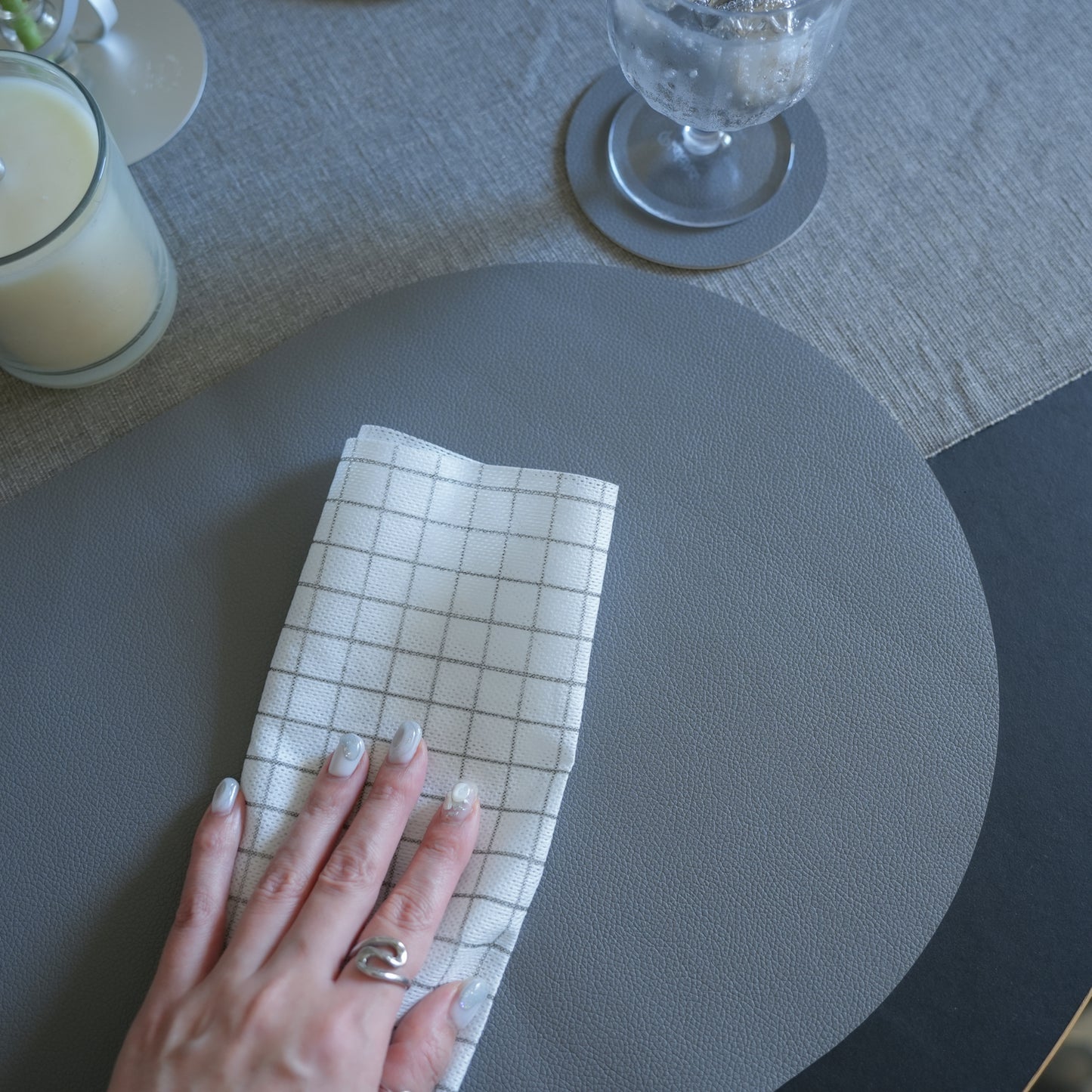 落ち着いたグレーのトーンで統一されたランチョンマットとコースターのセット。