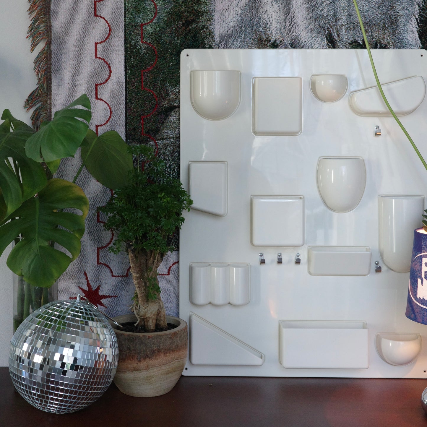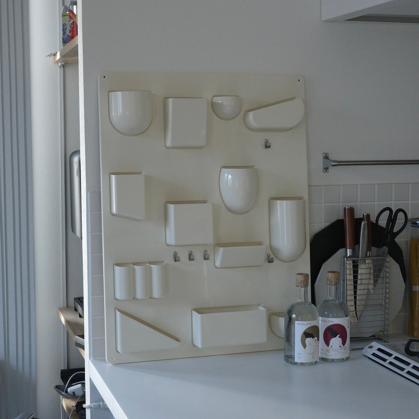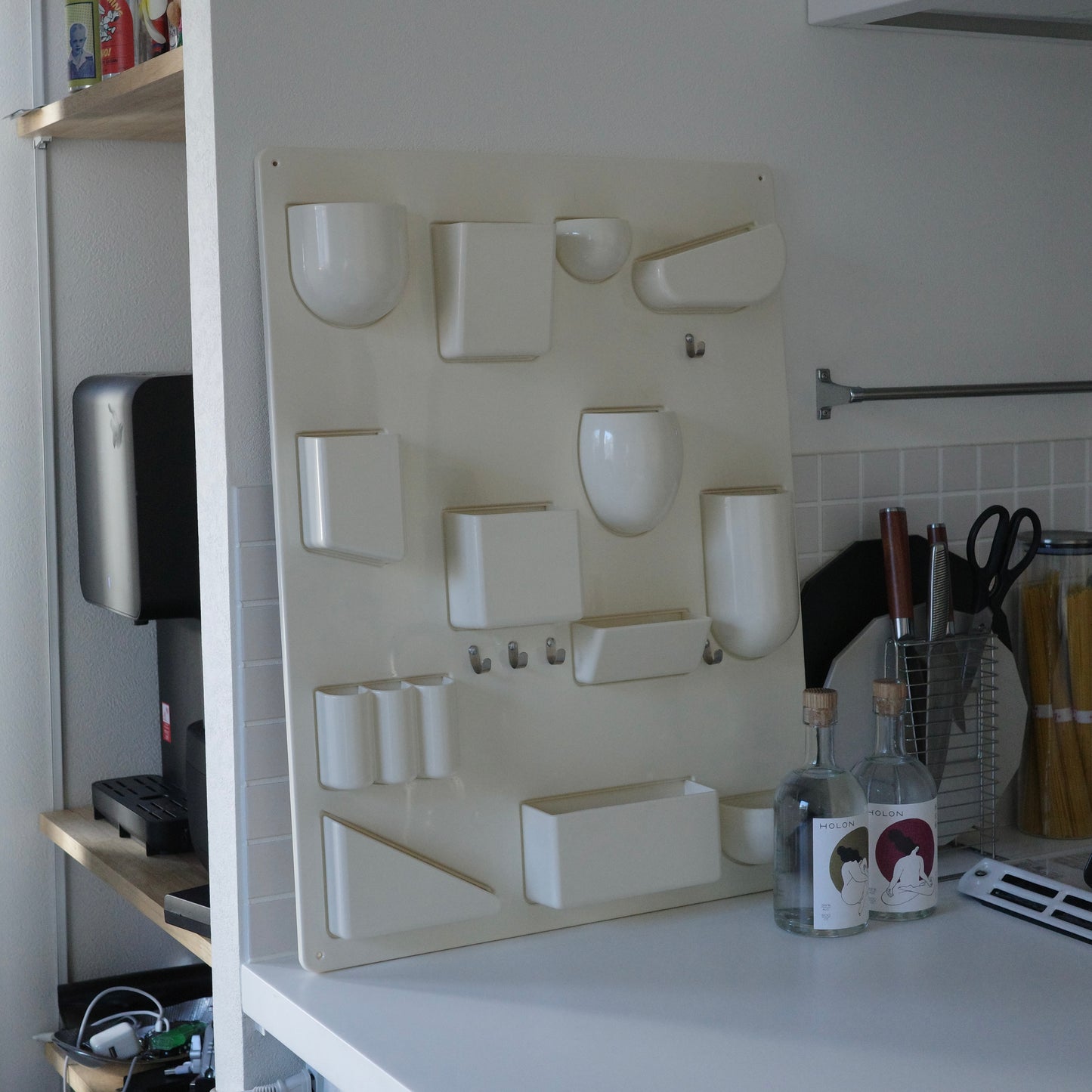 大小さまざまな形状のポケットやフックが一体となったデザインで、文房具やガジェット、コスメ、観葉植物まで、自由な発想で収納が楽しめます。