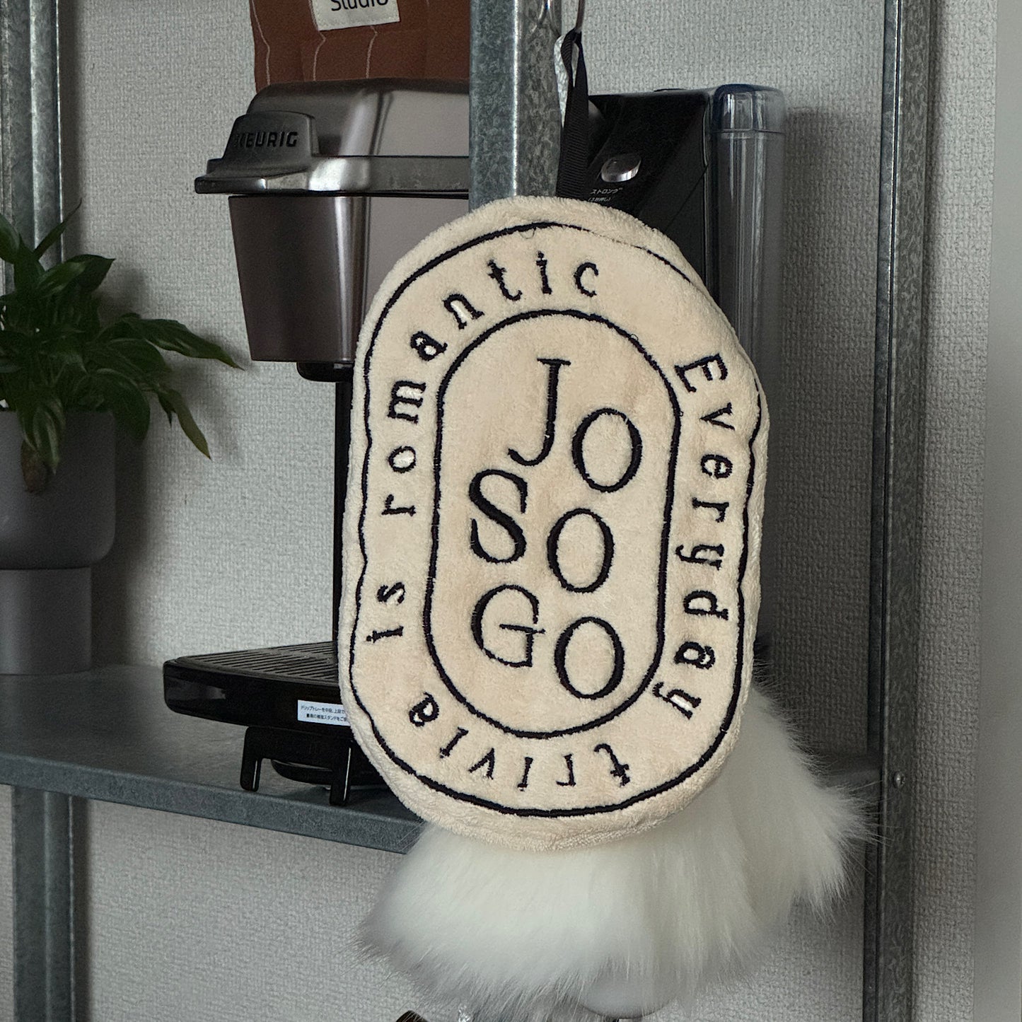 笑い素材感で日常使いしやすく、ちょっとした手拭きとしてはもちろん、フックにかけてインテリアのアクセントとしても楽しめるアイテム。 フロントには「JOSOGO」の文字と、円を描くように配置されたフレーズが刺繍されていて、シンプルながらユニークな存在感を放ちます。
