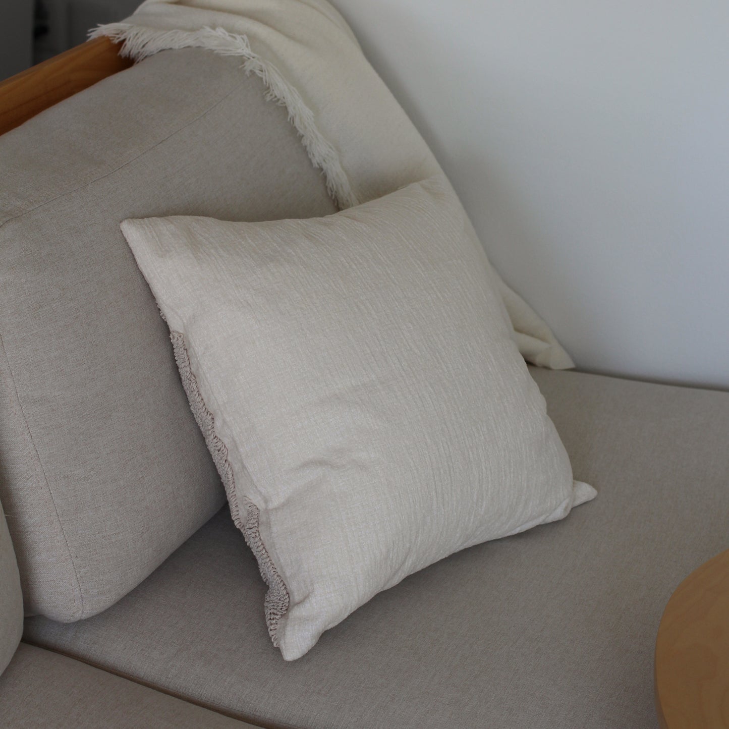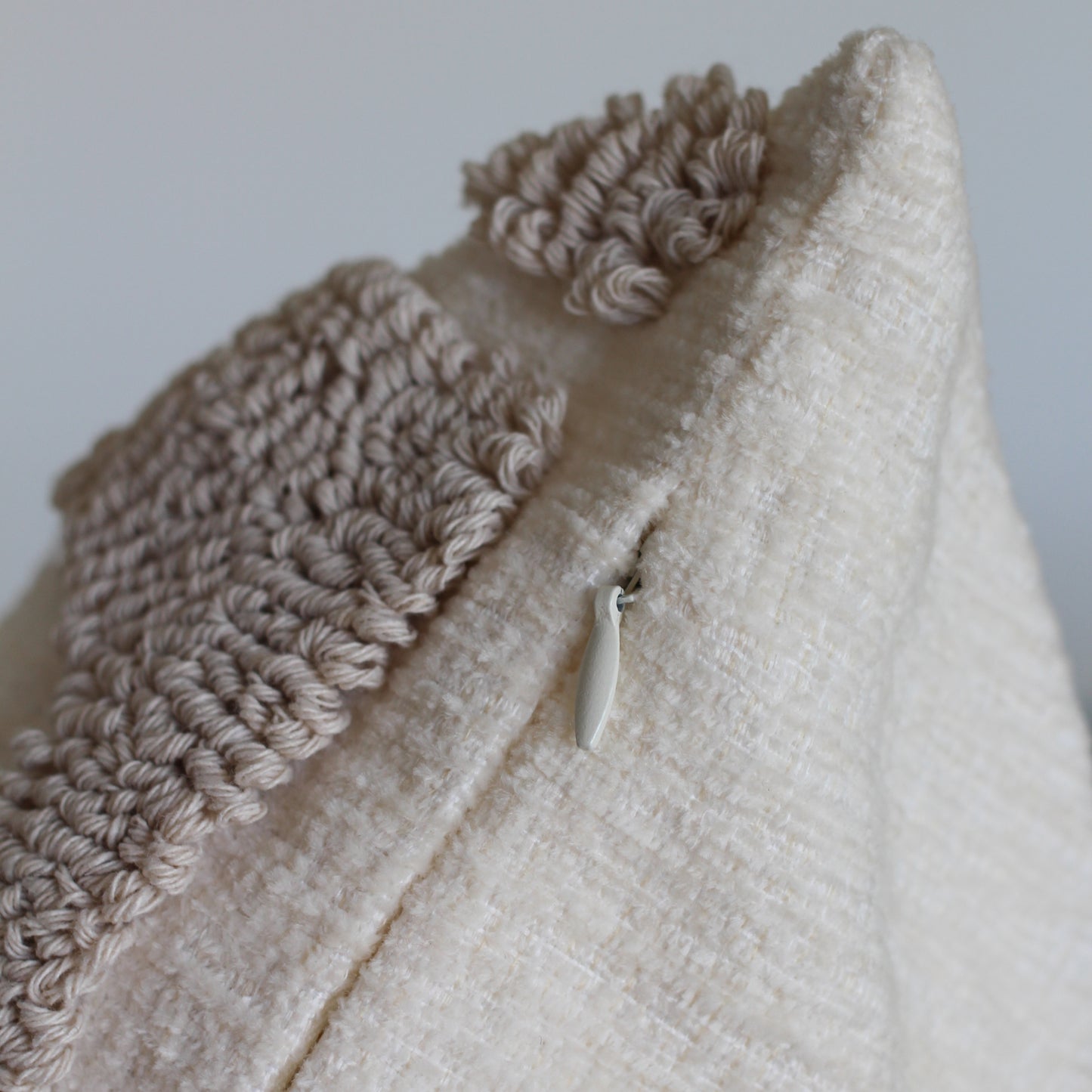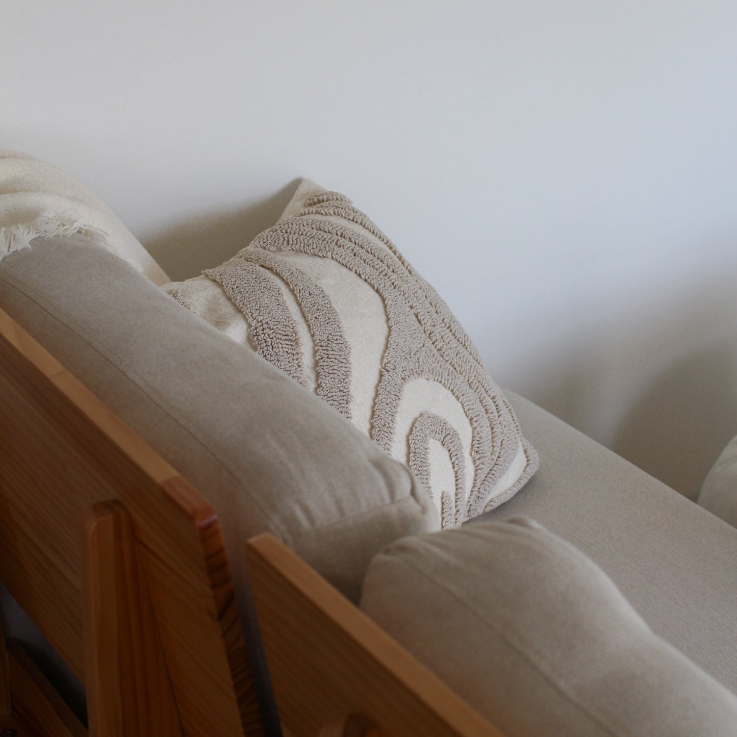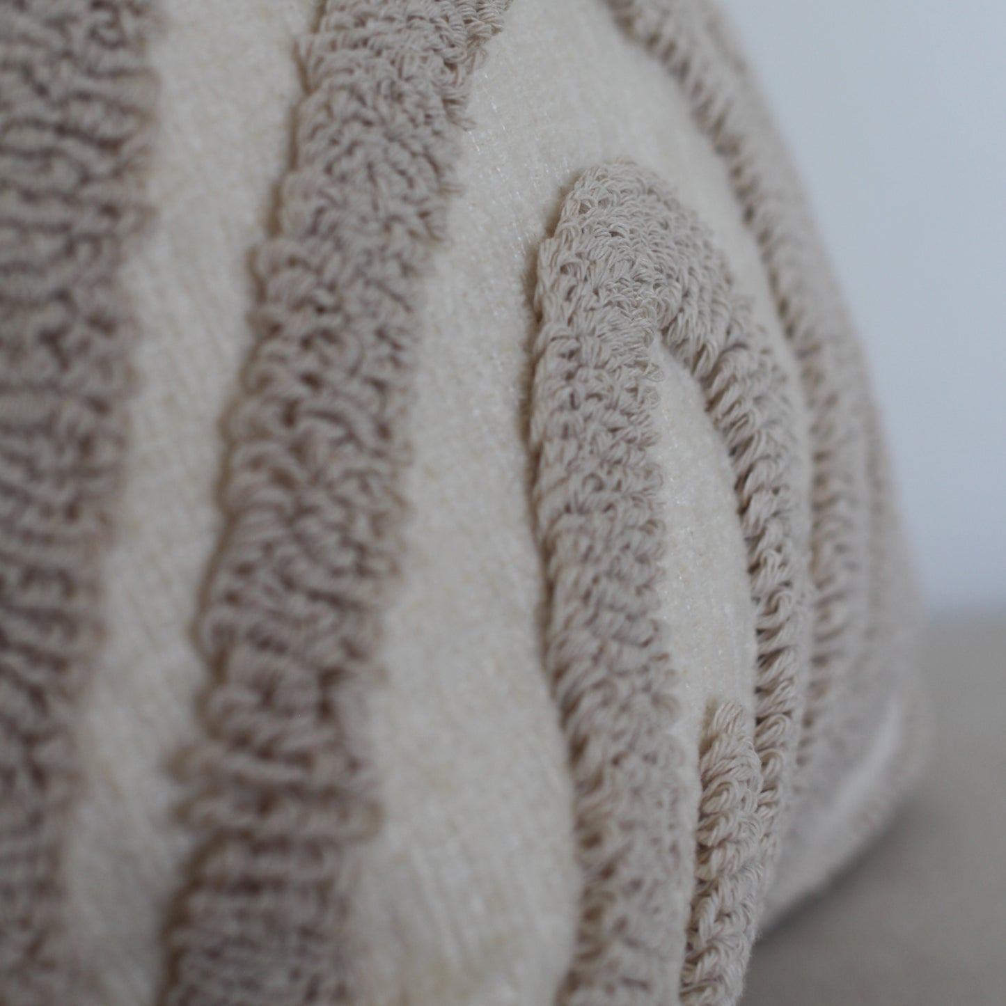 ナチュラルなベージュトーンながら体感的なパイル模様が施されたクッションカバー。 抽象的なラインデザインがシンプルながらも存在感を放ち、ソファやベッドに置くだけでインテリアをスタイリッシュに演出します。 ナチュラルやモダン、北欧テイストとも相性がよく、季節を問わず取り入れやすいアイテム。