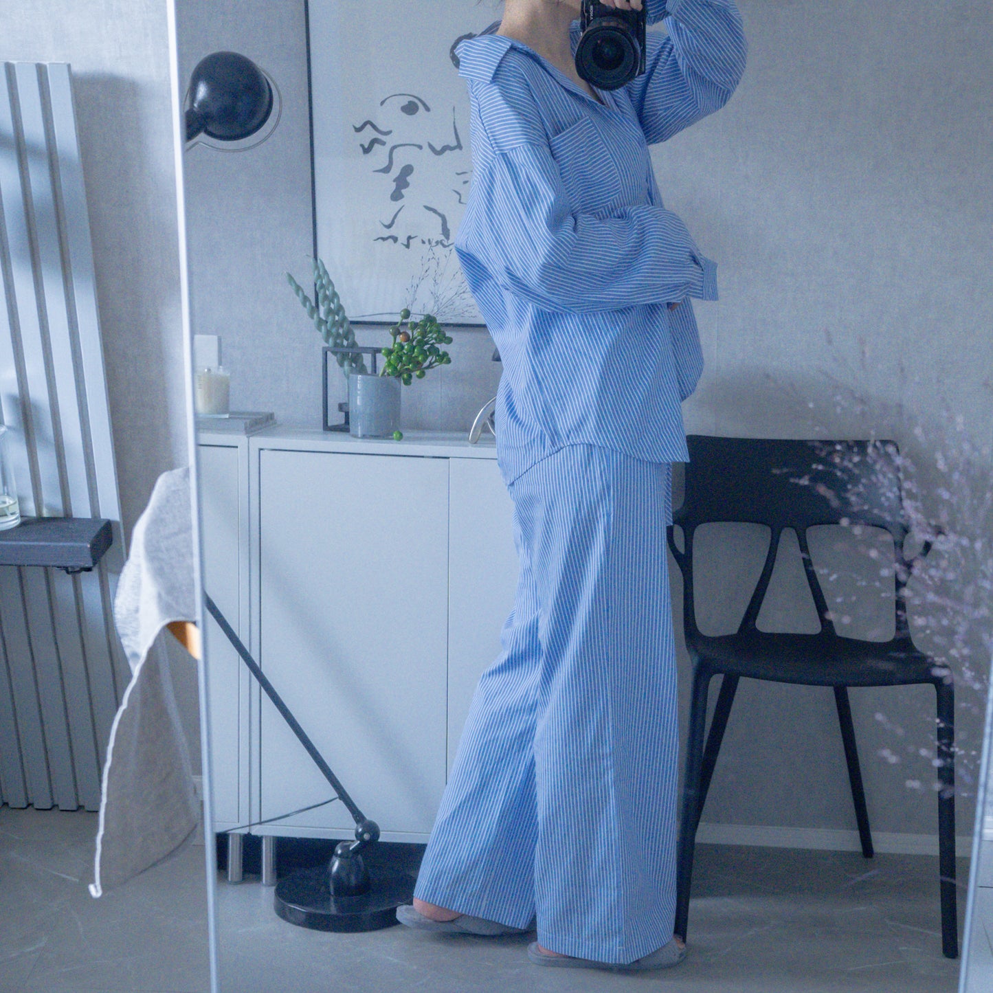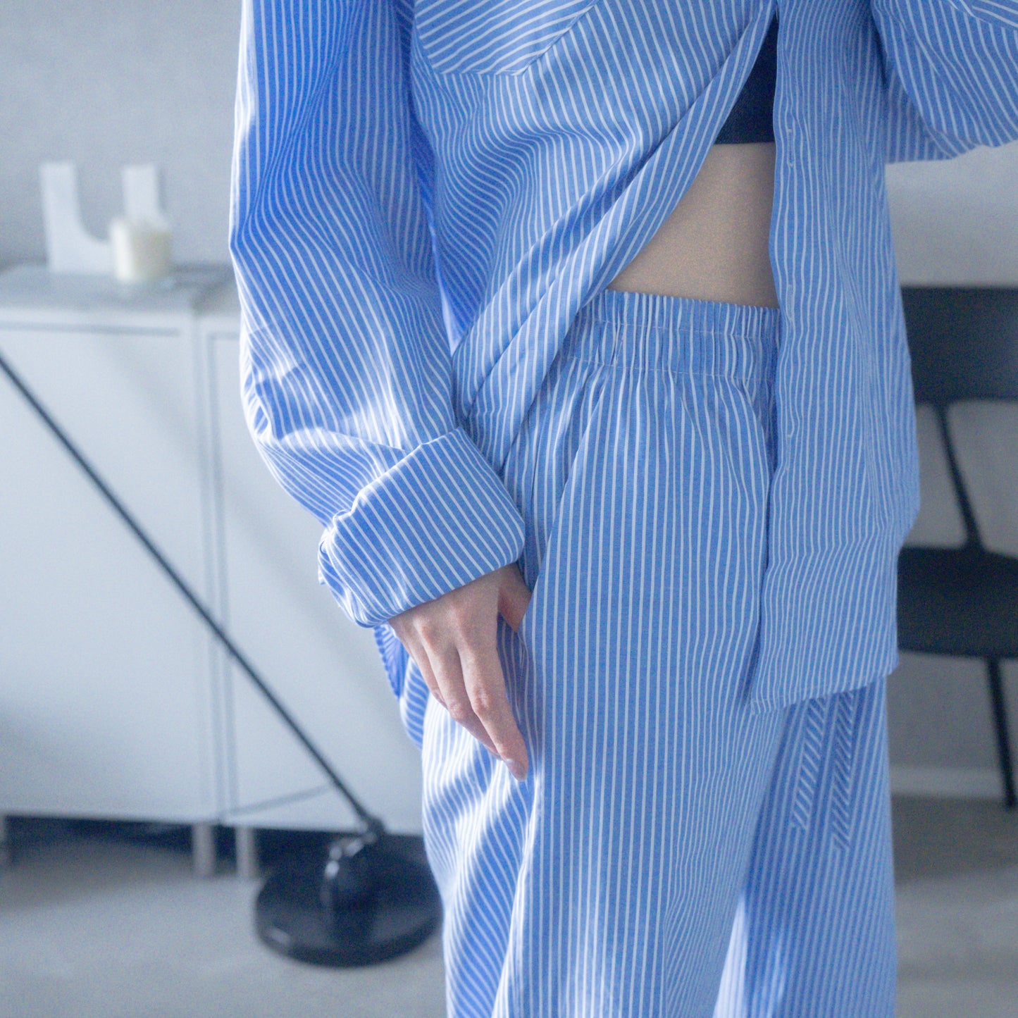 爽やかなブルーのストライプ柄が印象的な、リラックス感あふれるルームウェアセット。 トップスは抜け感のあるバランス、パンツはウエストゴム仕様で快適な着心地を実現しました。