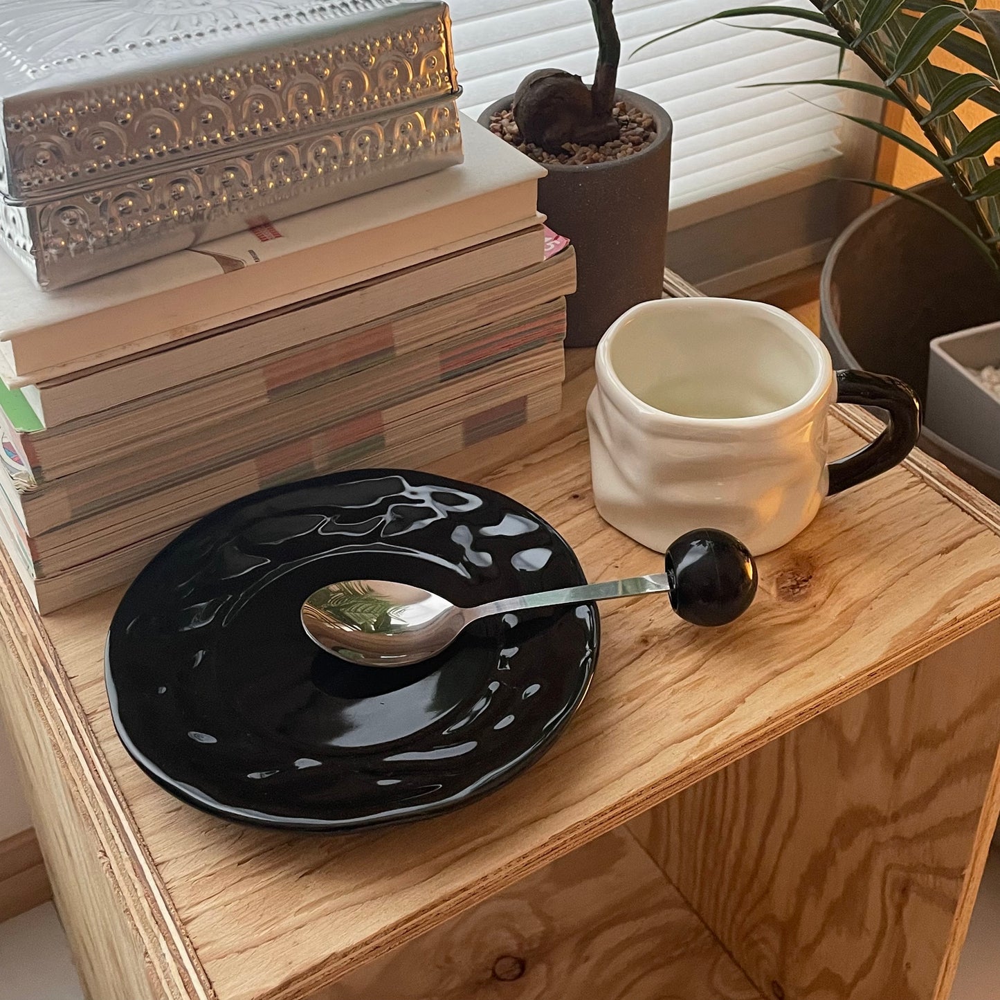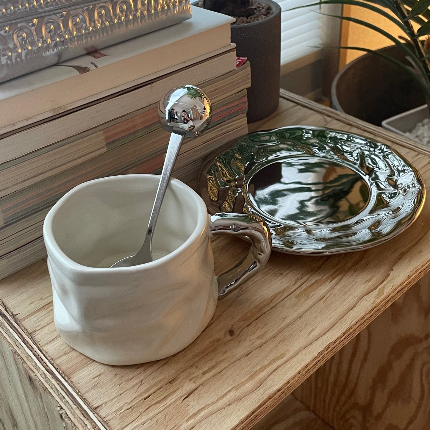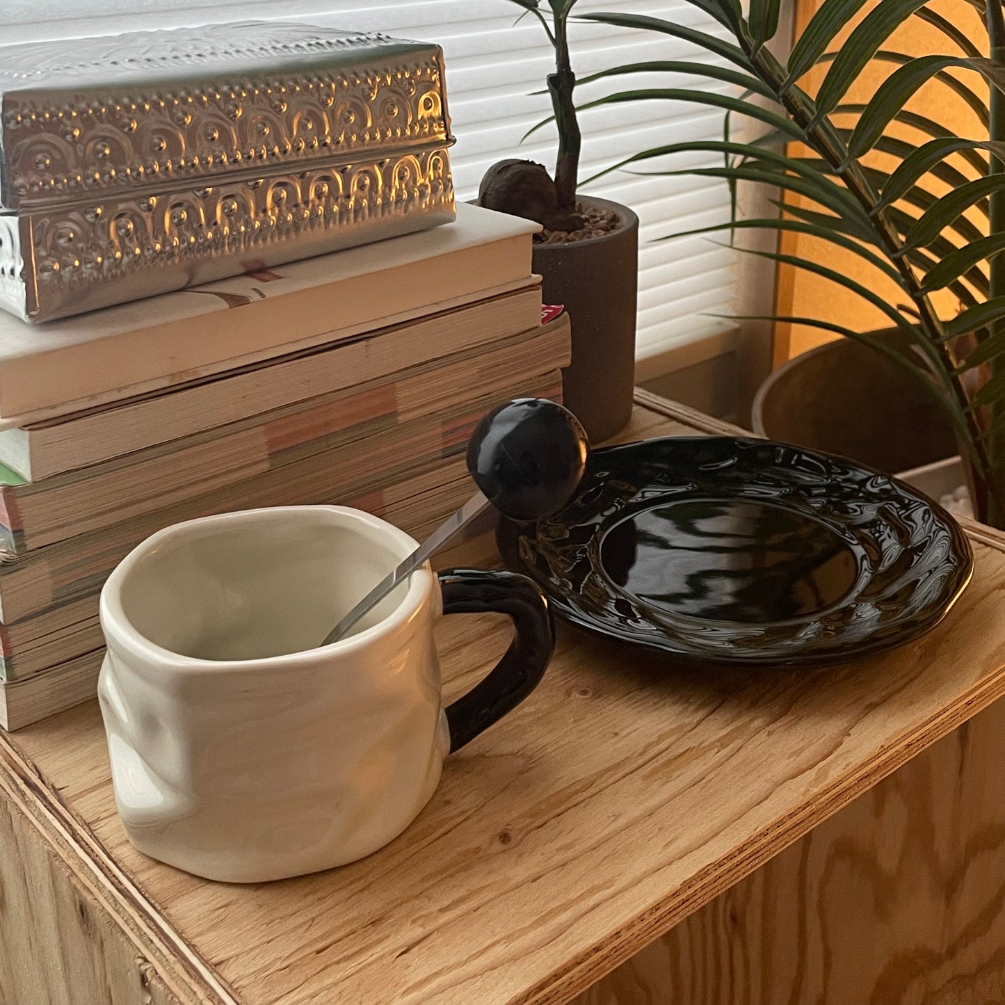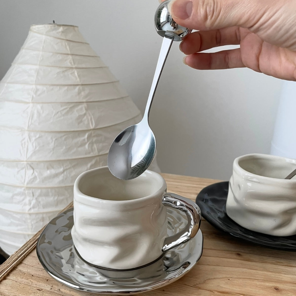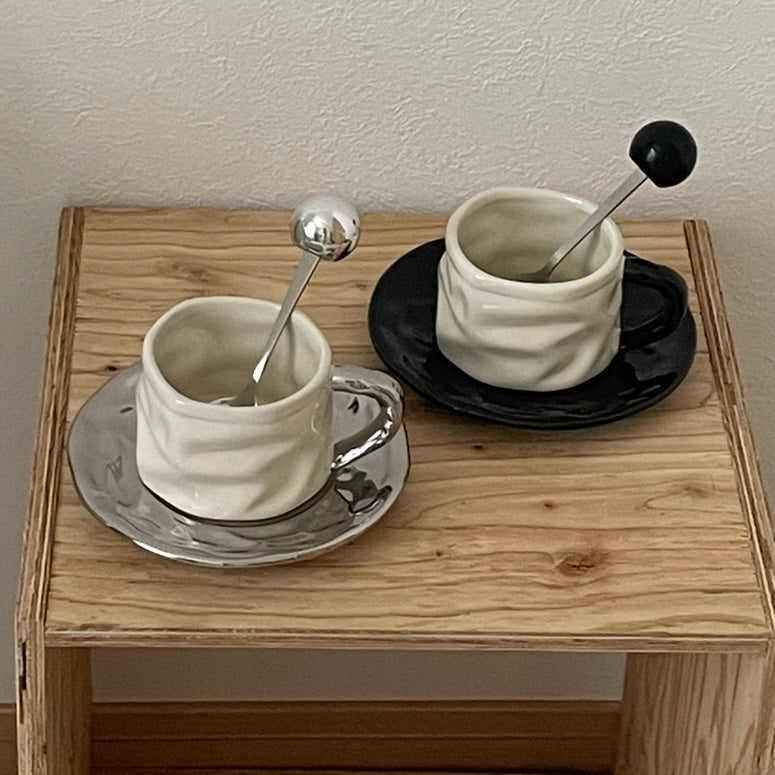 手作りのようなやさしい表情のマグカップに、光沢のあるソーサーとスプーンを添えた3点セット。