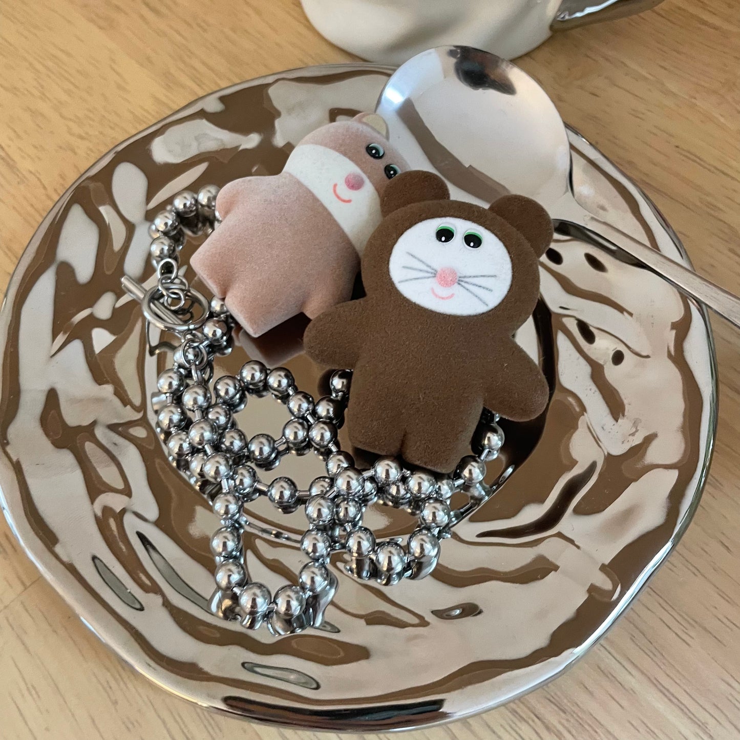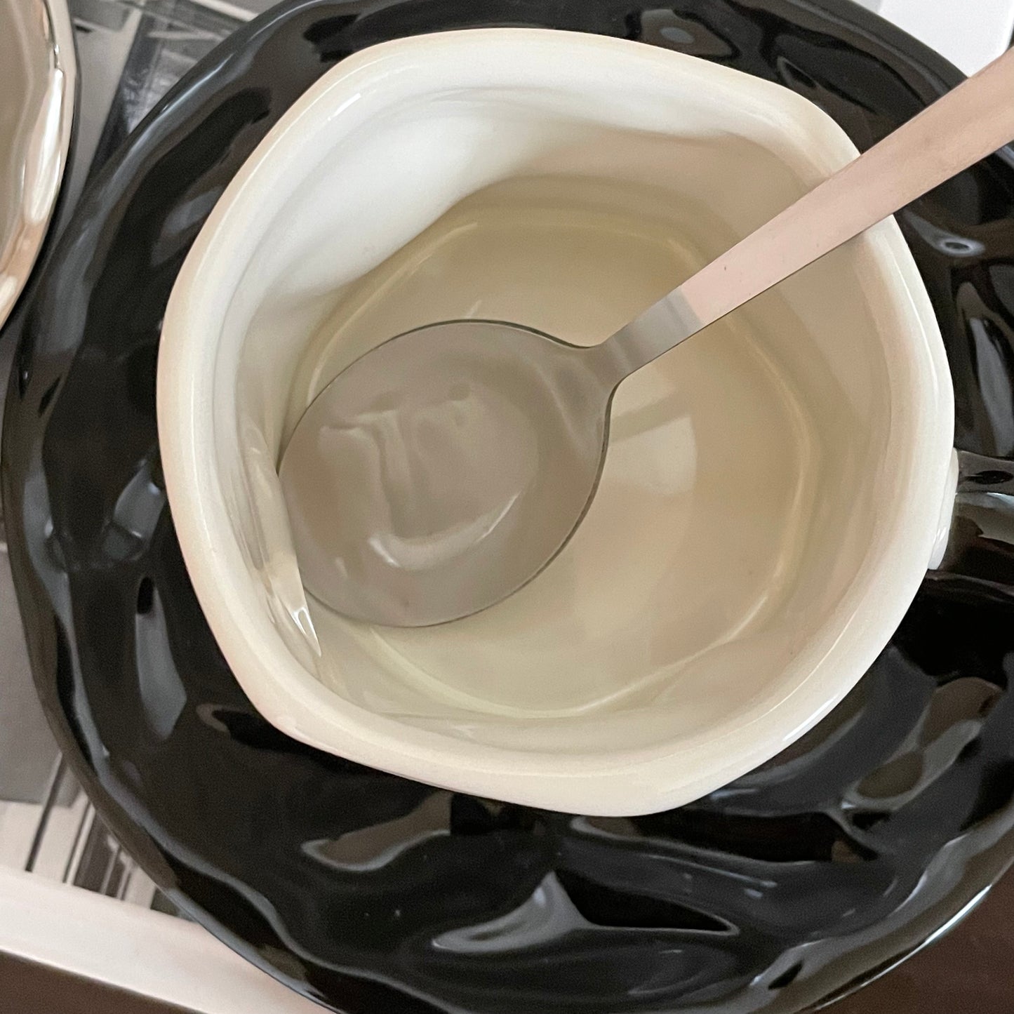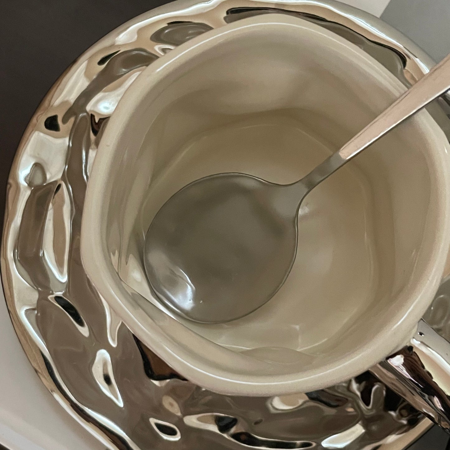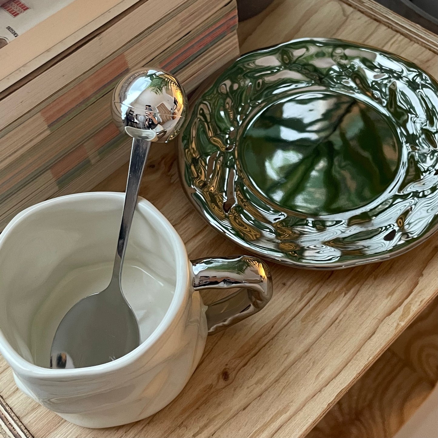 手作りのようなやさしい表情のマグカップに、光沢のあるソーサーとスプーンを添えた3点セット。