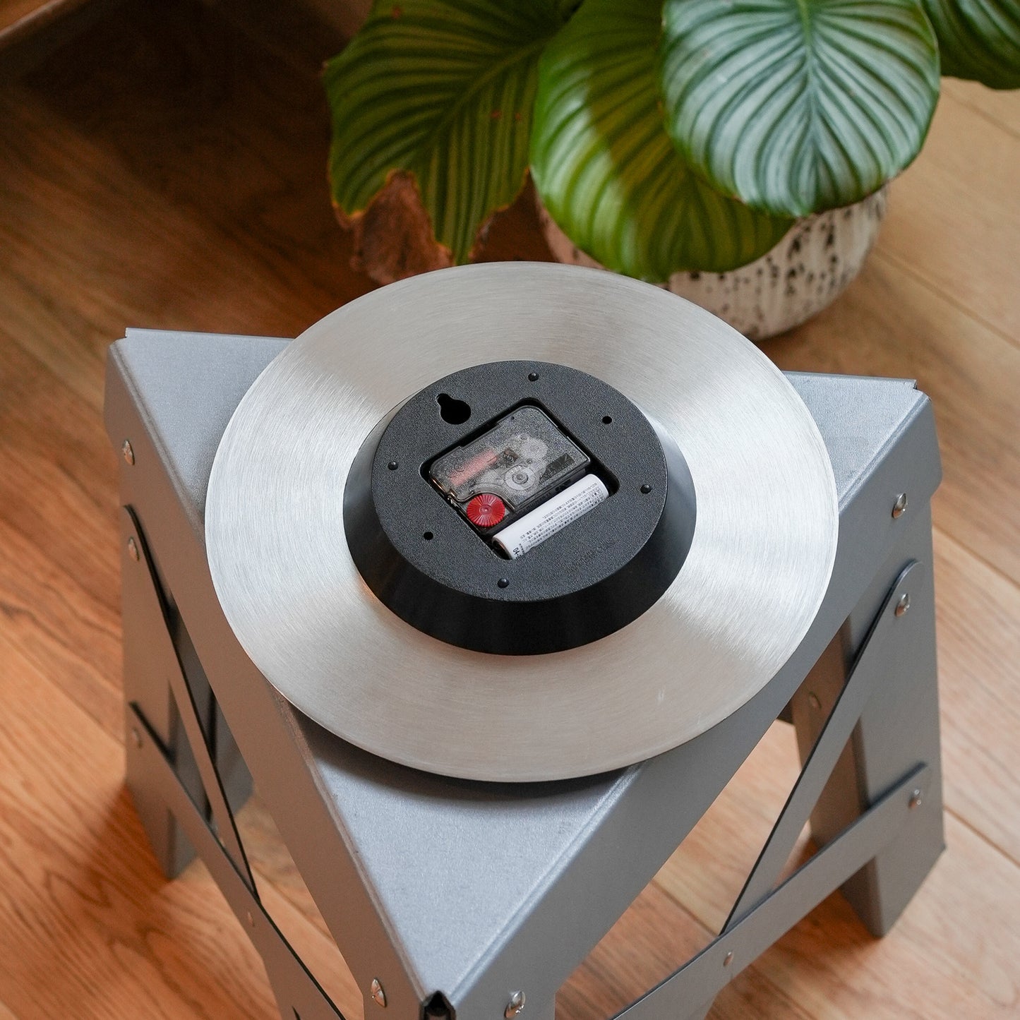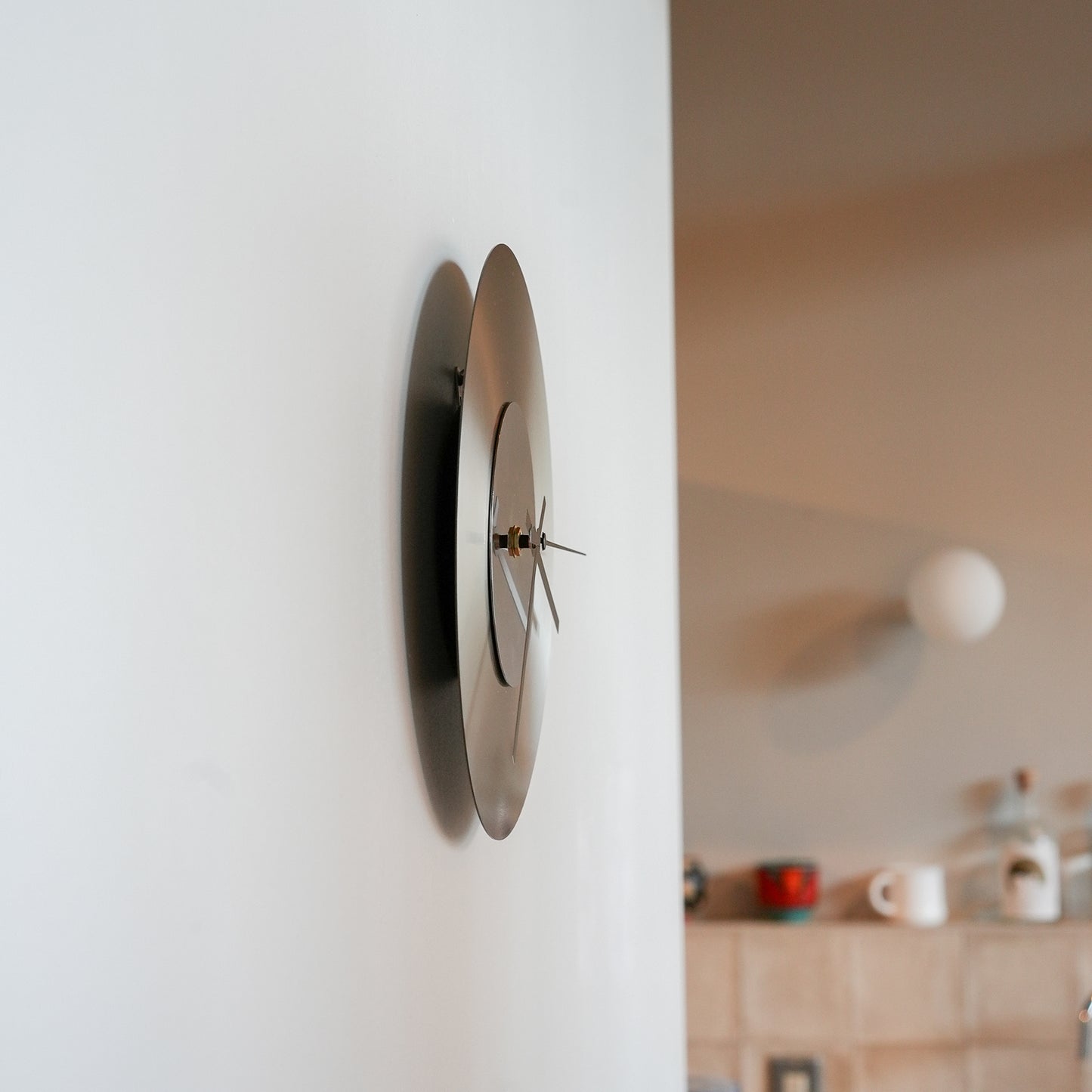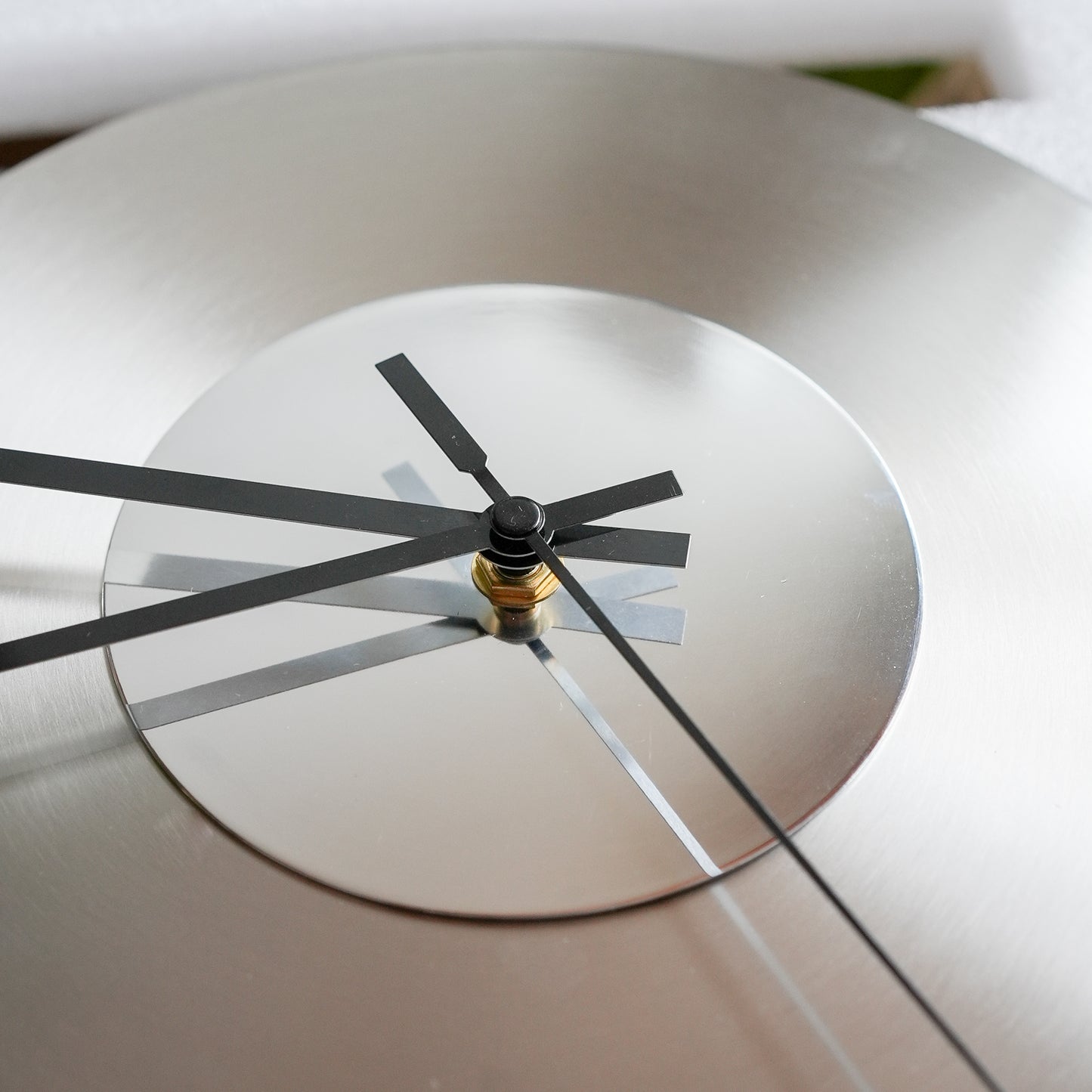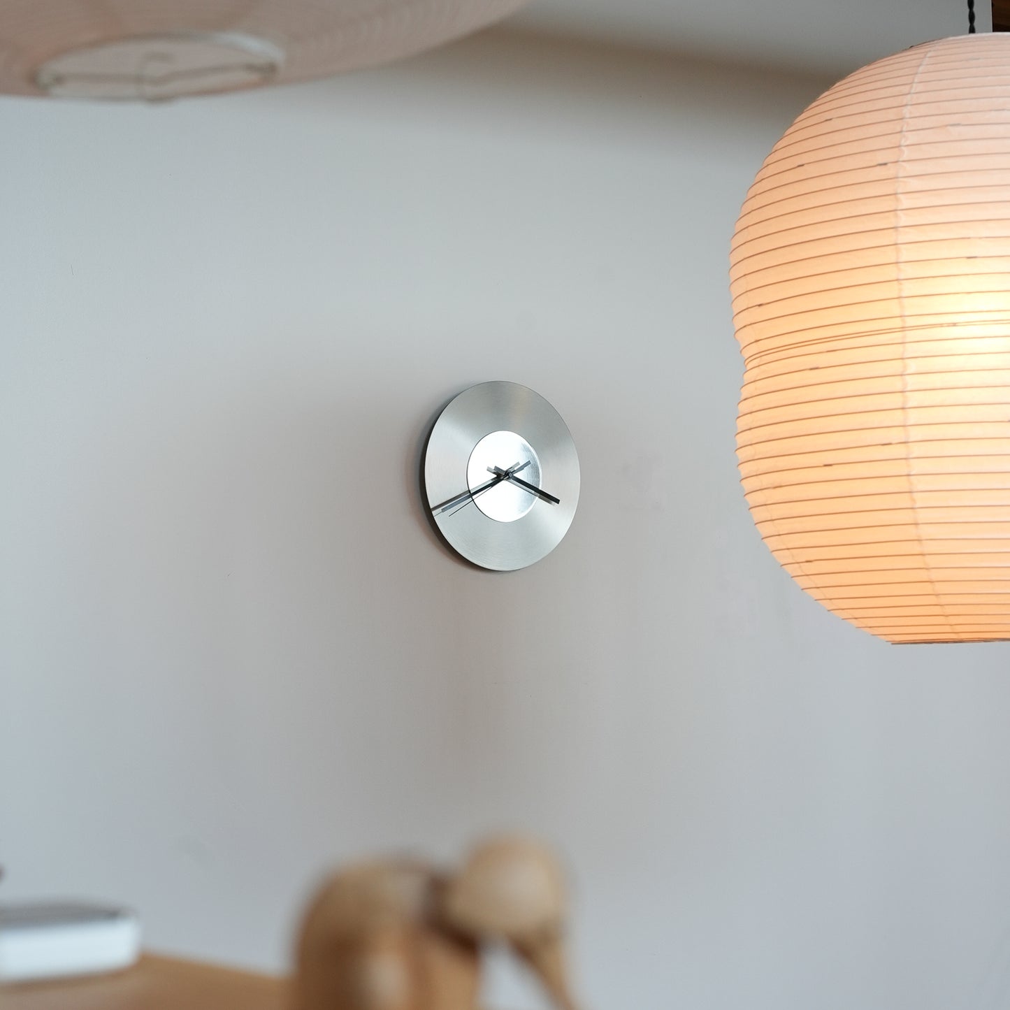 削ぎ落とされたフォルムと、ステンレスのマットな質感が際立つ壁掛け時計。
