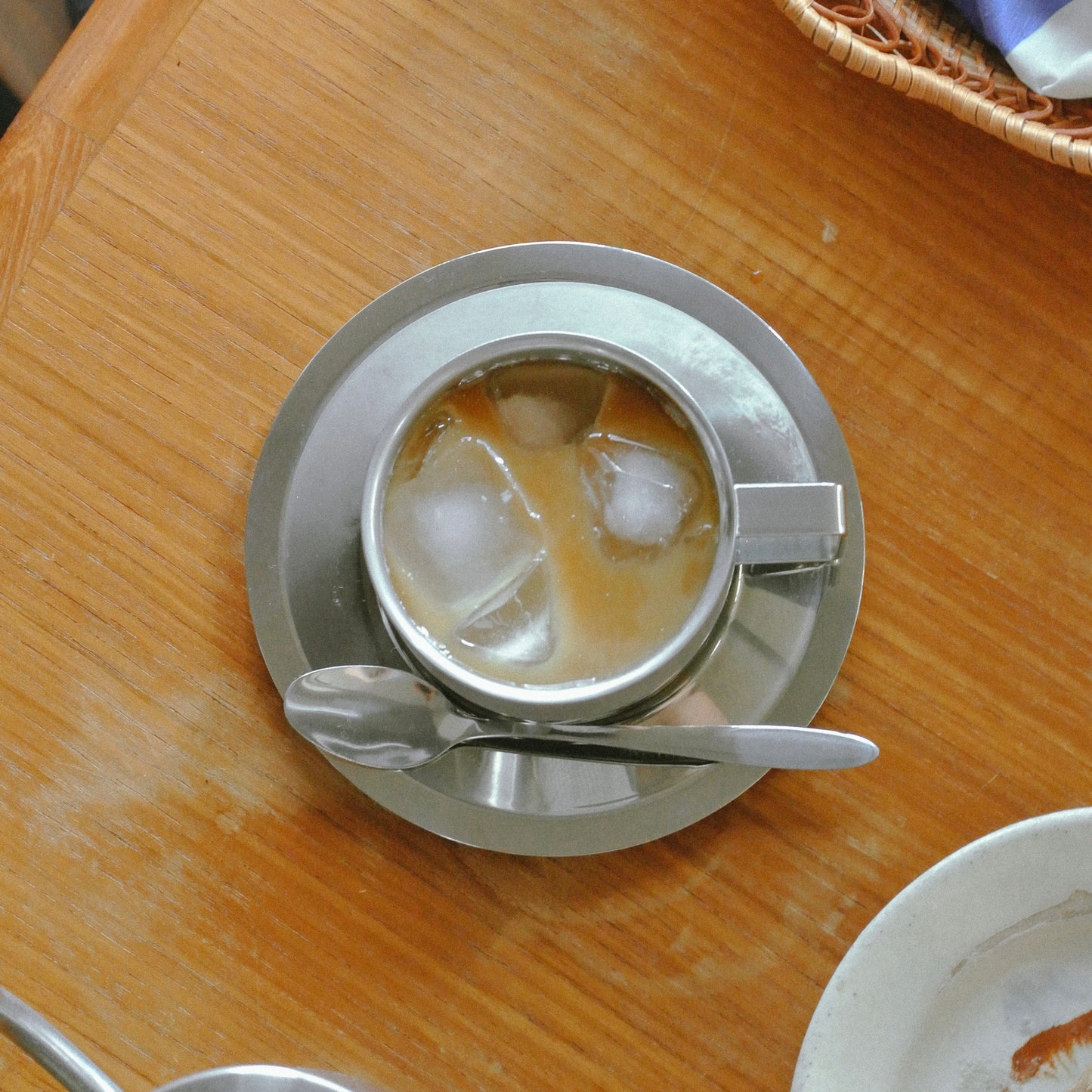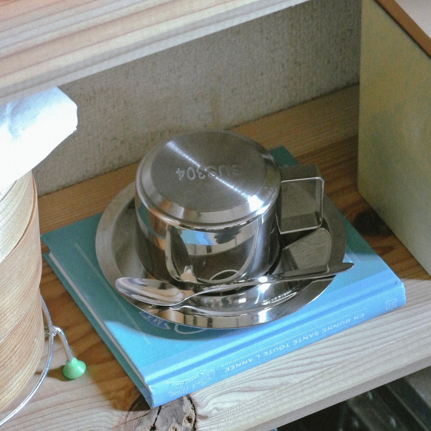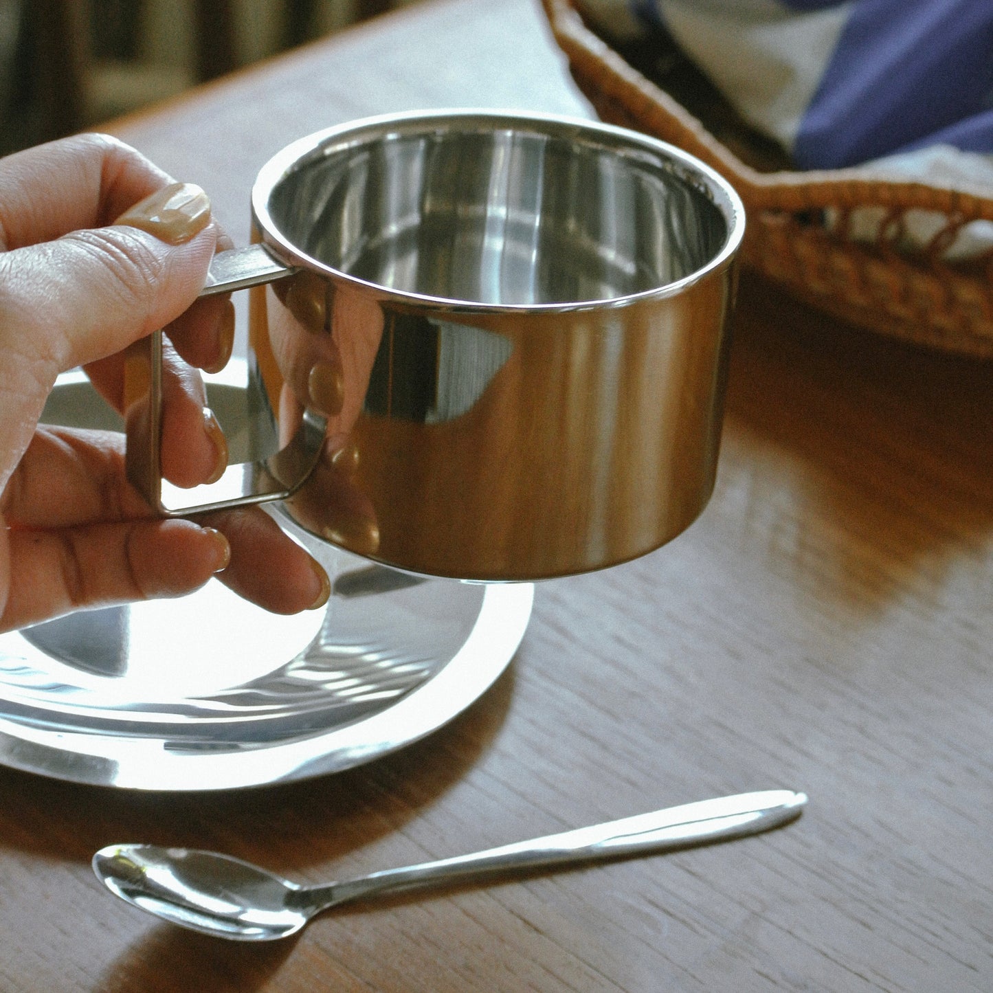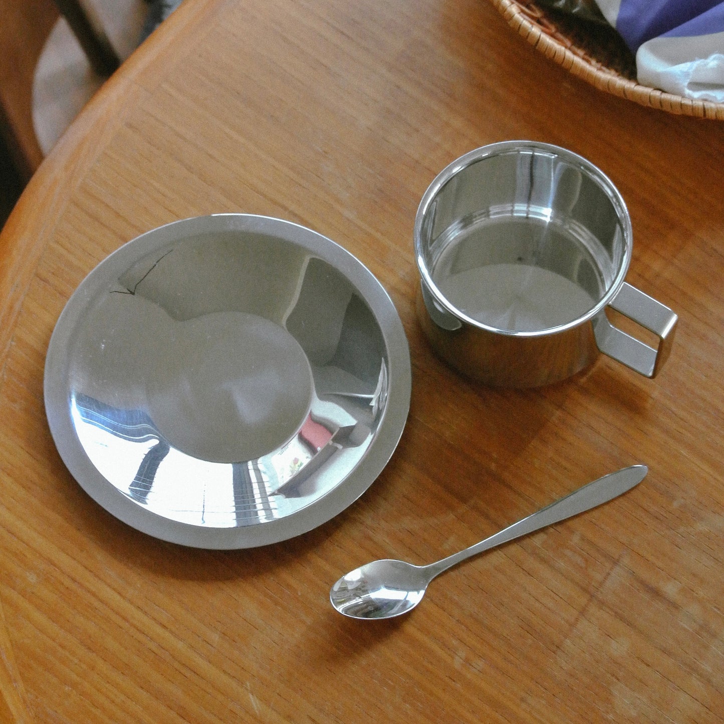 マグ・ソーサー・スプーンが揃った、ステンレスのシンプルなセット。